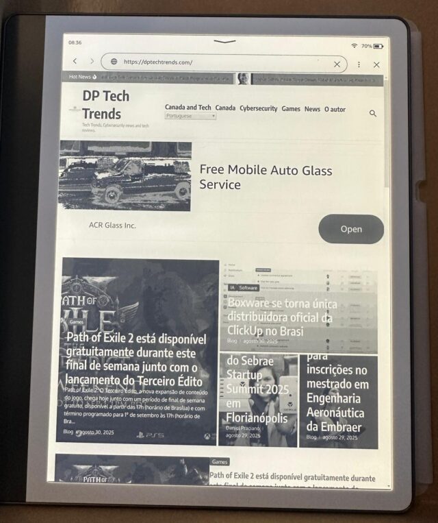 Faz tempo que não faço reviews do Kindle, desde 2021, e portanto o que vou falar aqui pode nem ser novidade. Porém, no Scribe notei que há um navegador web como havia no primeiro Kindle ao menos. É um navegador bem básico. Ele avisa que páginas simples terão navegação menos limitada, mas páginas com animações sofreram. É um plus, mas você não usa o Kindle para estar conectado. Antes havia uma possibilidade de postar partes do livro lido no Twitter (hoje X), mas isso se perdeu há muito tempo. E isso eu lamento. Enfim, o navegador é um recurso a mais. É interessante ter, mas não é essencial ao dispositivo.